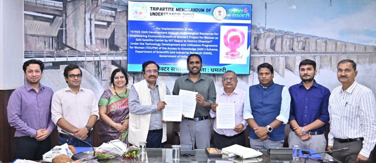 रायपुर: ग्रामीण महिलाओं के आर्थिक एवं सामाजिक सशक्तिकरण की दिशा में धमतरी जिले में एक ऐतिहासिक पहल की गई है। कलेक्टोरेट परिसर में नेशनल इंस्टीट्यूट ऑफ टेक्नोलॉजी (NIT) रायपुर, जिला प्रशासन धमतरी और बीआरपी शासकीय पॉलिटेक्निक कॉलेज के बीच ‘STREE’ (Skill Development through Technological Resources for Empowering Economic Growth of Women) परियोजना के सफल क्रियान्वयन हेतु त्रिपक्षीय समझौता ज्ञापन (MoU) पर हस्ताक्षर किए गए।