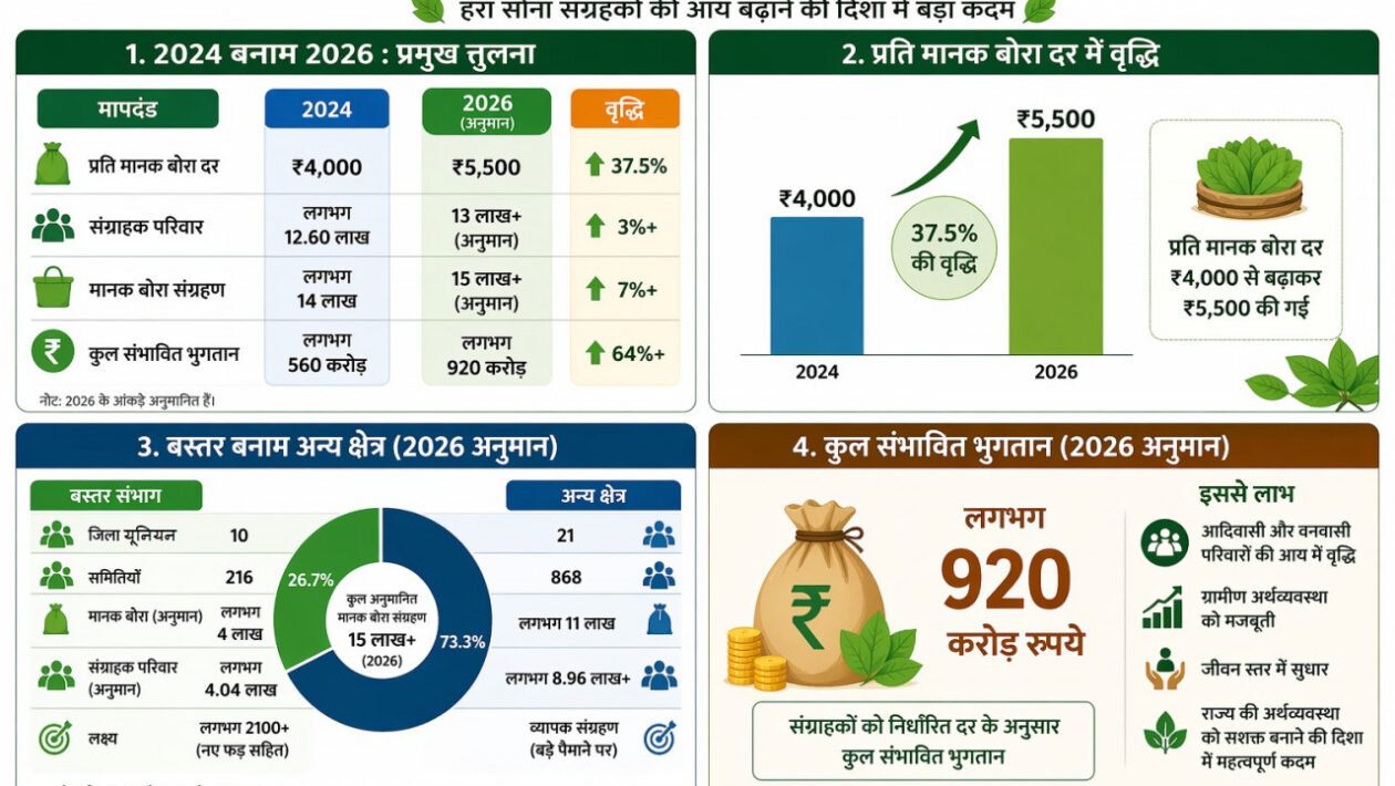 हरा सोना संग्राहकों की आय बढ़ाने की दिशा में बड़ा कदम, लगभग 920 करोड़ रुपए का होगा संभावित भुगतान, तेंदूपत्ता संग्रहण कार्य में जुड़े 13 लाख से अधिक तेन्दूपत्ता संग्राहक परिवार…