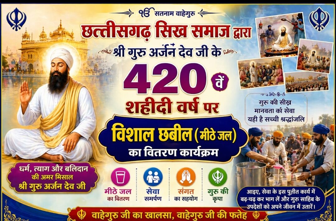 *सिक्खों के पांचवें गुरु श्री गुरु अर्जन देव जी के शहीदी दिवस अवसर पर छत्तीसगढ़ सिक्ख समाज करेगा विशाल शरबत वितरण कार्यक्रम*
