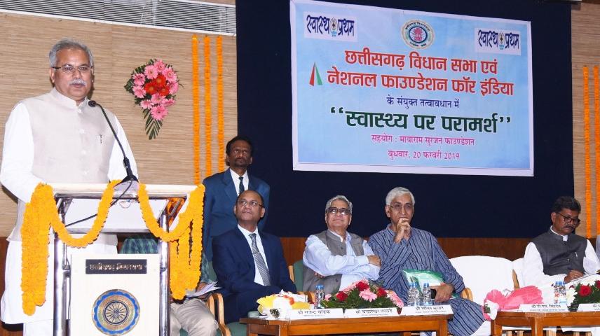 रायपुर, मुख्यमंत्री भूपेश बघेल ने आज यहां विधानसभा परिसर स्थित डॉ. श्यामा प्रसाद मुखर्जी सभागृृह मंे ‘स्वास्थ्य प्रथम‘ विषय पर आयोजित स्वास्थ्य पर परामर्श कार्यक्रम को संबोधित करते हुए कहा कि स्वास्थ्य आज भी बड़ी चुनौती है। बीमारियों से बचने के लिए साफ पेयजल, स्वच्छता और जागरूकता जरूरी है। ऐसा करने से छोटी-मोटी बीमारियों से आसानी से बचा जा सकता है। छत्तीसगढ़ विधानसभा द्वारा नेशनल फाउण्डेशन फॉर इंडिया के तत्वावधान में और मायाराम सुरजन फाउण्डेशन के सहयोग से आयोजित इस कार्यक्रम में विधानसभा अध्यक्ष डॉ. चरणदास महंत, नेता प्रतिपक्ष धरमलाल कौशिक और स्वास्थ्य मंत्री टी.एस. सिंहदेव विशेष अतिथि के रूप में उपस्थित थे।